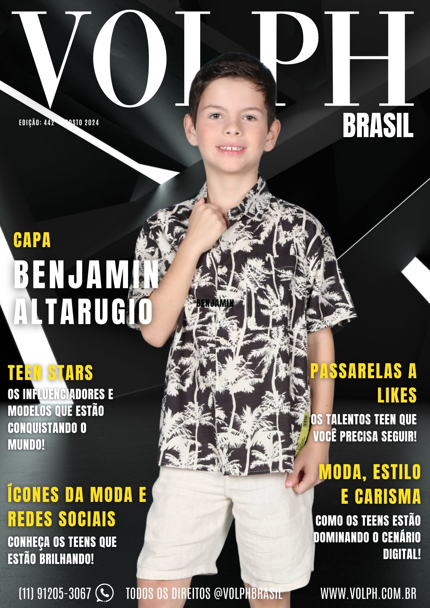 Benjamin Altarugio Rivet, de apenas 8 anos, é um jovem talento que começou sua carreira de modelo e influenciador de forma bastante natural. Tudo teve início quando Benjamin foi chamado para participar de uma seletiva de talentos kids em sua cidade natal, Campinas, SP. “Meus pais me levaram, eu tirei fotos com um fotógrafo profissional, e desde então, minha mãe criou uma conta no Instagram para mim, e estou curtindo muito”, conta Benjamin.