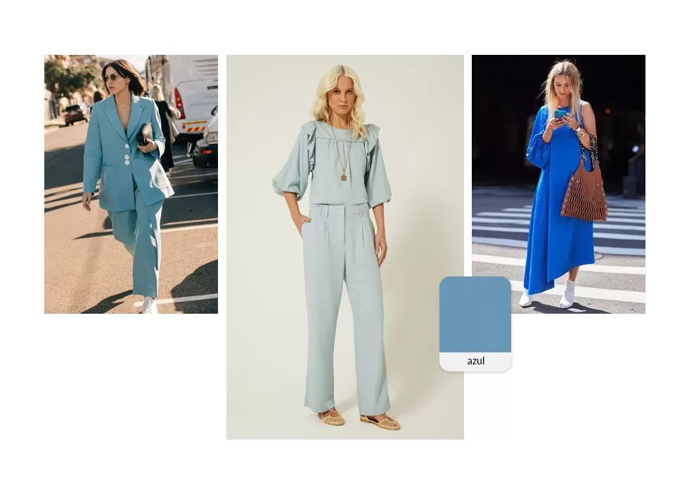 Uma cor que exala juventude: o azul. Os tons mais escuros transmitem autoridade e sabedoria. Já o significado das cores das roupas em azul-claro está mais relacionada às pessoas sonhadoras, afinal, comunicam delicadeza e suavidade. Se você também não abre mão dessa tonalidade que remete ao mar, o céu e as flores, uma sugestão é trazer para produção as possibilidades de estampa azul e ativar o modo serenidade.